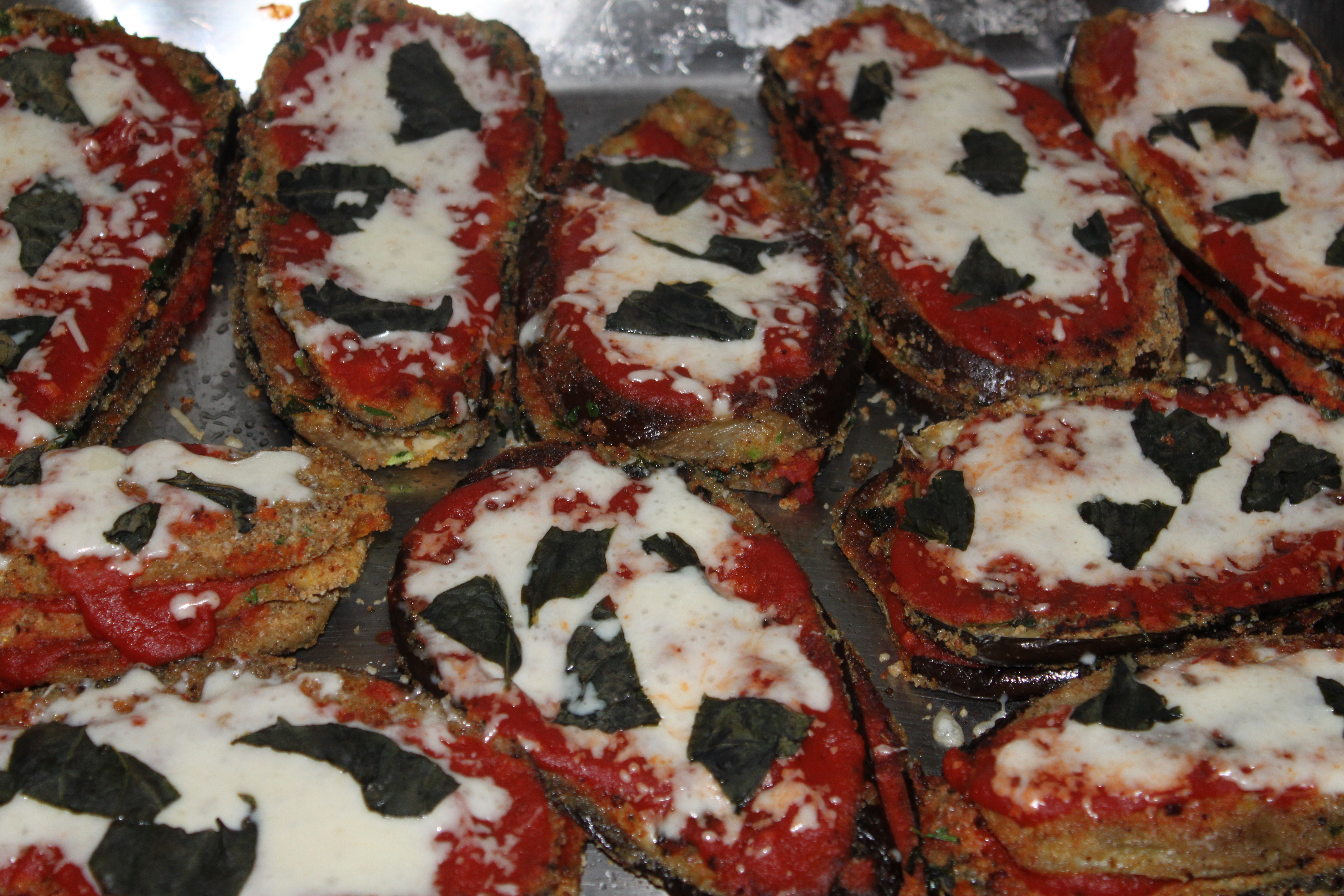 Vicki usually makes a couple small changes to the recipe. This time she used mozzarella cheese instead of provolone, no pesto, and she made her own tomato sauce which usually means lots of garlic, fresh herbs and beefy tomatoes. She also sprinkled fresh basil on top with the mozzarella. Oh and she did not peel the eggplant. We both found it just as tasty and more healthy with the skin on. Enjoy!