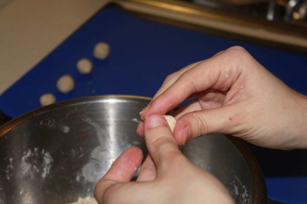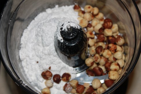 Put oven rack in middle position and preheat oven to 350 F. Line 2 or 3 baking sheets with parchment paper(or silicon baking pads). Grind 3/4 cup toasted hazelnuts (the hazelnuts should be cooled and any loose skins rubbed off in a kitchen towel) with 1 cup confectioner’s sugar in a food processor until powdery (be careful not to process to a paste.)