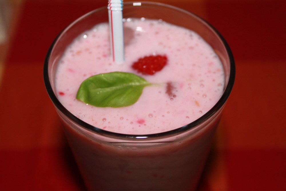 Put a generous handful of raspberries, 1 ripe banana, freshly squeezed juice from 1/2 of a lime, 1/2 cup milk, and couple of ice cubes into a blender. Blend and pour into a tall glass filled with ice cubes.
