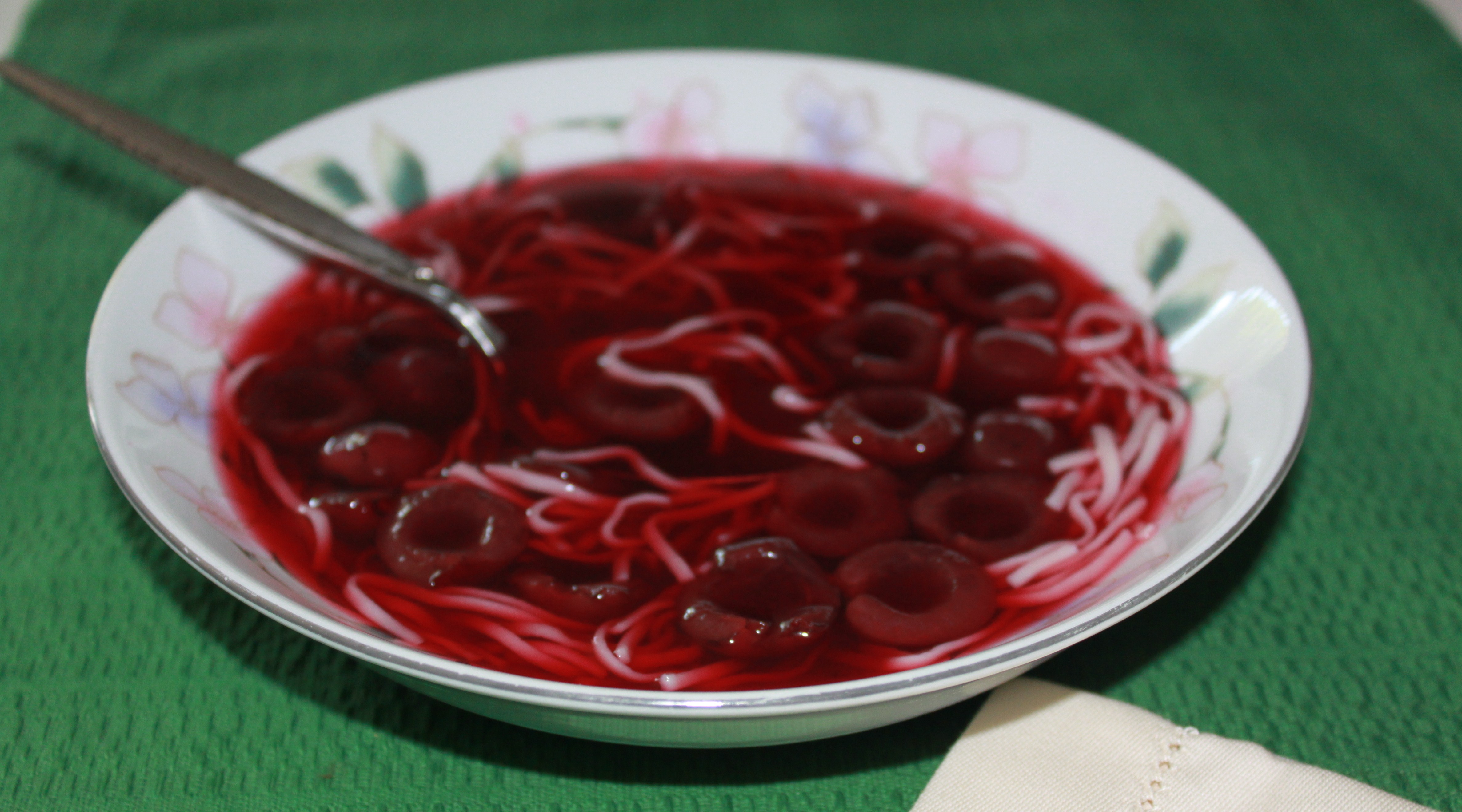 Place 5 cups water, 1 cup red wine (I used Pinot Noir), 1/2 cup sugar, 1 1/2 lbs pitted dark cherries, pinch of salt, 1 long strip of lemon zest studded with 4 cloves, 1/2 stick of cinnamon, 1/2 by 1-inch piece of fresh ginger(sliced into smaller pieces) and heat on medium-high heat until it starts bubbling. Turn the heat to low, cover, and simmer for 15 minutes or until the cherries are soft but not mushy. Discard the lemon peel, cinnamon stick, ginger and chill the soup. Serve with noodles.
