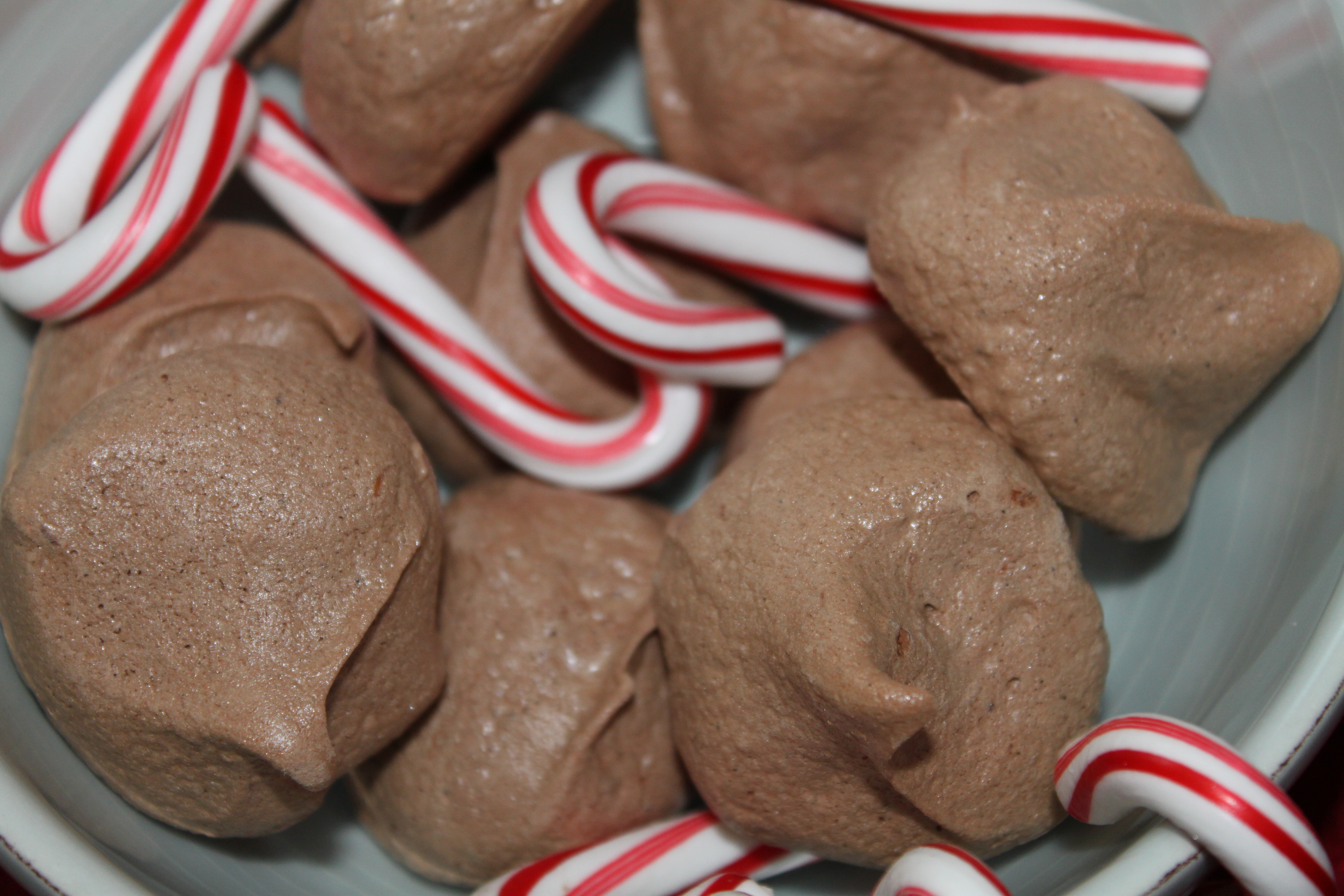 Preheat oven to 250 degrees. Line 2 baking sweets with aluminum foil. In a bowl of an electric mixer fitted with a whisk attachment, beat egg whites on high speed until they hold soft peaks. Slowly add the sugar and the vanilla and beat until they hold stiff peaks. Reduce the speed to low and beat in the cocoa powder. With a rubber spatula, fold in chocolate chips.