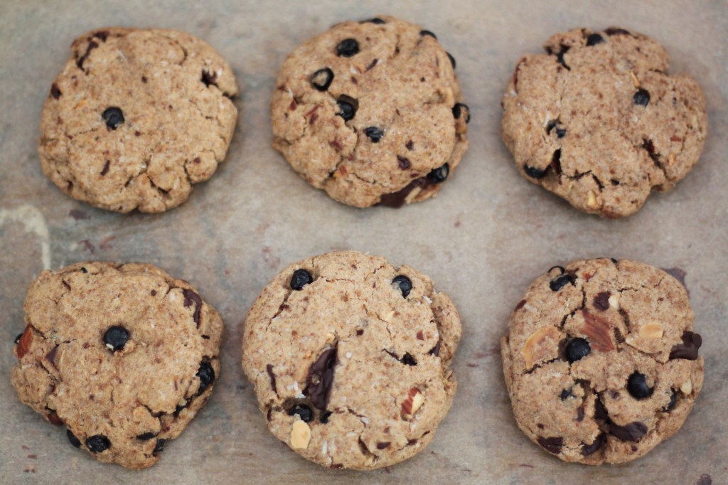 In a small bowl, whisk the buckwheat flour and baking soda together and set aside. In a medium bowl, whisk the sugars, coconut oil, vanilla extract and sea salt. Add the egg and whisk until well combined. Using a rubber spatula, fold in the flour until the dough comes together. Add the shredded coconut, slivered almonds, blueberries and chocolate and mix until combined (try not to over-mix the dough). Preheat the oven to 350 F and line a baking sheet with parchment paper.