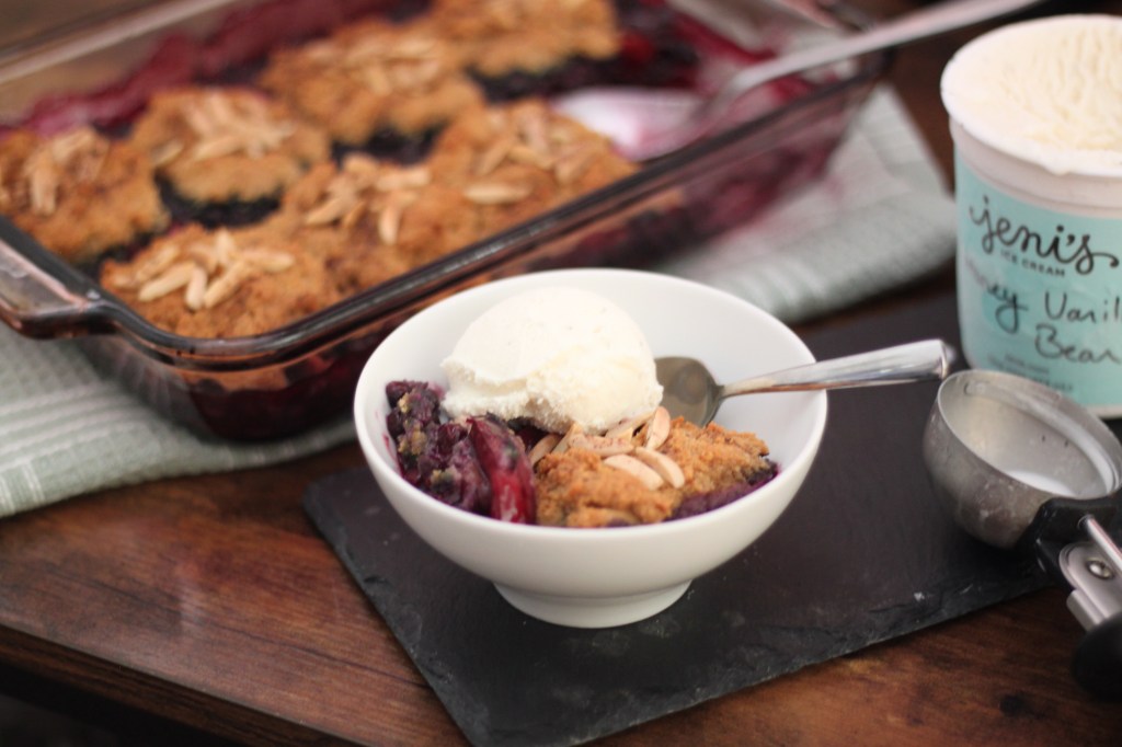 In a large bowl, add the filling ingredients and mix. Pour into a 11×8 inch glass baking dish and add the dough on top. Top with the slivered almonds and cinnamon and bake 45-50 mins until the top is golden and nicely toasted. Let cool slightly and enjoy. You can serve it warm right out of the oven with a dollop of vanilla ice cream.